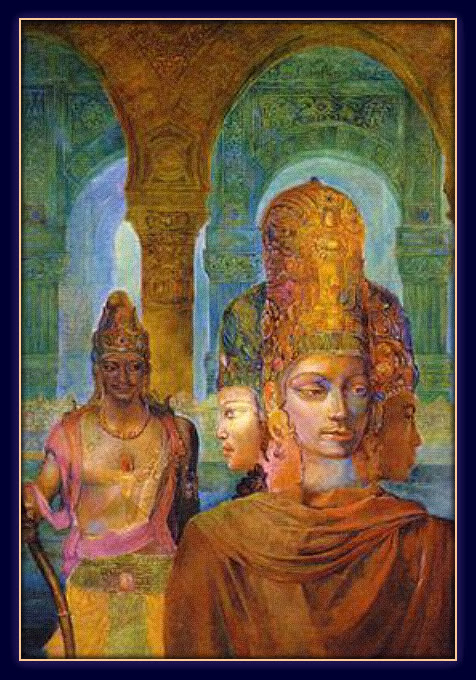 (1) Maitreya said: 'Thus the brahmins again churned the arms of the king who had no son and from that action a child couple took birth. (2) About that child couple being born the sages conversant with the Vedas said that they were very happy, knowing that it concerned an ['âves'a'-]expansion of the Supreme Lord. (3) The sages said: 'This man is an expansion of the Supreme Lord Vishnu who maintains the world and this woman is Lakshmî, the Goddess of Fortune who is an inseparable, integral part of the Original Person. (4) This male will be the first among the kings and will spread his reputation under the name of Prithu ['the one of the earth'], becoming widely renown as the Great King. (5) This female will, as a goddess of all good qualities, enhance the beauty of her ornaments with the magnificence of her teeth; she will be named Arci and will attract Prithu with her great beauty. (6) He, as a partial, direct representative of the Lord, is born with the desire to protect the entire world and she took birth as the inseparable goddess who is very attracted to him.'(7) Maitreya said: 'The brahmins praised him, the singers of heaven chanted, the perfected ones showered flowers and the girls of heaven were dancing. (8) Filling the air with vibrating conches, bugles, drums and kettledrums and such, all the godly souls, the sages and the elderly of all sections of society gathered there. (9-10) Brahmâ, the master of the universe, accompanied by the godly arriving there together with all the leaders of the enlightened world, saw on the right hand of that son of Vena, the mark of Vishnu carrying the club. His two feet also showed the [marks of the] lotus flower and thus he was certain that he dealt with a partial appearance of the Lord who with His invincible disc [as a mark in His hand] as a plenary portion represents the Supreme Interest. (11) The brahmins attached to the rituals arranged for his coronation and thus the people for his sake from everywhere collected the different means for performing the ceremony. (12) The rivers, the seas, the mountains, the serpents, the cows, the birds and the animals, the sky, the earth and all living beings contributed with different kinds of gifts. (13) He was thus crowned the Mahârâja. Exquisitely dressed and fully ornamented he, together with his nicely jeweled wife Arci, appeared like a fire beyond compare. (14) The keeper of wealth Kuvera, donated a royal throne made of gold, oh hero, and Varuna gave him an umbrella as brilliant as the moon from which constantly a mist of water droplets showered. (15) Vâyu in his turn gave him two camâras [whisks] made of hair, Dharma gave a garland that added to his name and fame, Indra gave a very valuable helmet while Yama gave him a scepter to rule the world. (16) Brahmâ armed him with spiritual knowledge, his wife Bhâratî, the Goddess of Learning [Sarasvatî], gave a transcendental necklace, the Supreme Personality [Hari, Vishnu] gave him a Sudars'ana disc and His wife Lakshmî gave him imperishable opulence. (17) Lord S'iva came with a sword decorated with ten moons and Durgâ gave a likewise shield showing a hundred moons. The moon god gave horses of the finest breed and the demigod Vis'vakarmâ presented a very beautiful chariot. (18) Agni gave a bow made of horn, Sûrya gave arrows as brilliant as sunlight, Bhûmi [the Goddess of the Earth] gave slippers that empowered him with mystic union and the gods of the heavenly planets gave him flowers day after day. (19) The art of drama, singing the finest songs, playing musical instruments as also the ability to make things appear and disappear, were given to him by those moving through the ether. The great sages blessed him with infallibility and the god of the ocean produced a conch shell for him. (20) The seas, the mountains and the rivers provided him passage for his chariot and professed bards and officials of prayer presented themselves praising him in verses. (21) Seeing them engaged in their offerings, the greatly powerful son of Vena spoke as follows, smiling with a voice as grave as the thunder of clouds.
